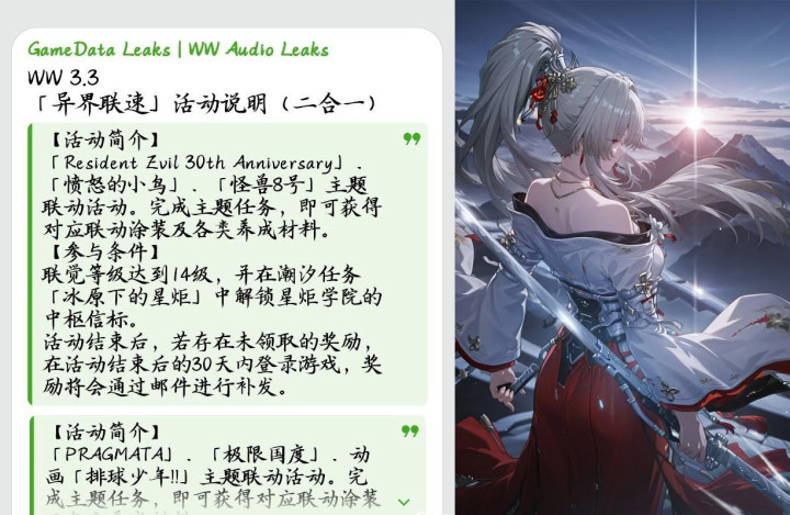 另外就是3.3版本的“异界联速”活动说明,根据描述,本次鸣潮3.3联动的内容还是蛮多的,甚至摩托还联动了生化危机等游戏。个人感觉多少有点夸张的不真实,真就小皮联动省钱省力随便联动了吗?而且感觉排球少年粉丝和玩家的重合度不大呀,这个也是公款追星吗?