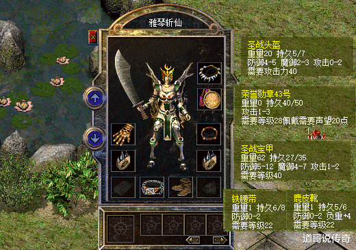 第四,服饰系列在老百区先看看有没有绝版腰带靴子,这位女战士就拥有鹿皮靴和铁腰带,虽说不是最强一档,但是多加那些防御属性已经很好了;至于圣战宝甲和43号荣誉勋章同样是赤月巅峰系列;最后看看那圣战头盔还是多加1点攻击上限的珍品,确实nice。总的来看,这位女战士的全身穿搭都属于高阶系列,如果能搭配运九套就比较完美了。