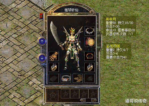 第一,跳点井中月在复古版本中,如果舍不得拿九套的话,用井中月练级效果很不错。如上图所示,这位女战士的井中月属性厉害了,居然升级了8点攻击属性上限,在跳点之后堪比裁决之杖,在没加幸运的前提下它的攻击下限要比裁决高多了,确实很少见啊。只可惜这把攻30井中月只有3点幸运值,因此搭配的也不是幸运链,而是同样攻击属性均衡的圣战项链。