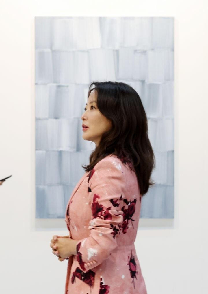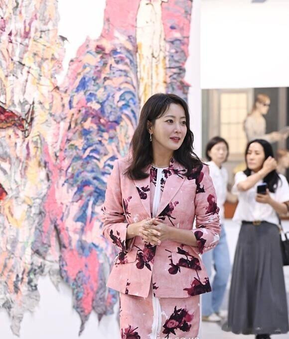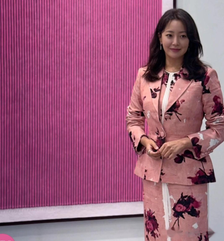 48岁金喜善出席活动生图, 一袭粉色印花套裙, 网友: 还是那么美