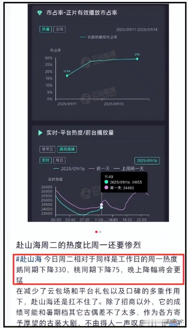 风波过后,有数据博主统计了《赴山海》的最新收视率,发现双平台的数据对比前一天都有明显下降,还预言到晚上更新的时候,降幅会更猛烈。