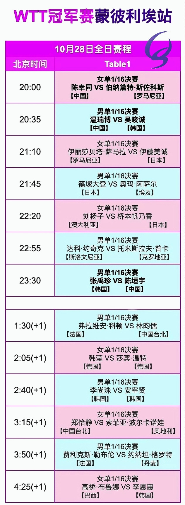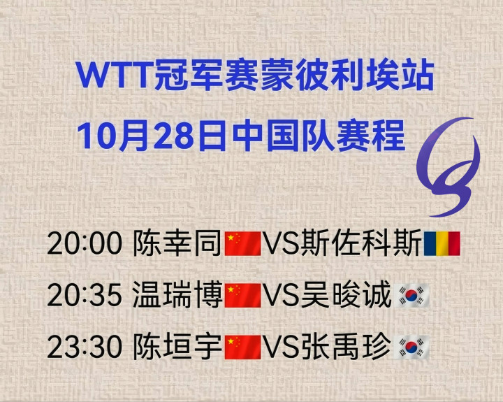 根据最新发布的赛程,10月28日的比赛将分两个时段进行,北京时间28日晚安排了7场比赛、北京时间29日凌晨安排了6场比赛。国乒DAY1共有3场比赛任务,陈幸同、温瑞博和陈垣宇率先登场首秀。陈幸同在揭幕战中迎战罗马尼亚一姐斯佐科斯,随后温瑞博与韩乒太子吴晙诚争夺本站第一个男单16强席位,陈垣宇在第一时段压轴之战中迎战韩乒大哥大张禹珍。