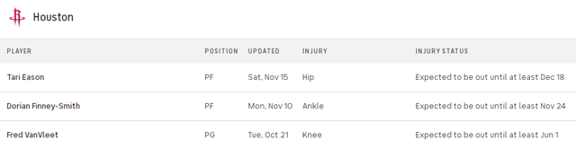 上一场火箭取得大胜,然而伊森手感不佳还意外受伤,不得不提前退出比赛。赛后乌度卡表示要检查之后才能知道伊森具体的伤情。休斯顿记者本-杜博斯在最新的文章中透露伊森至少要休息一个月。而根据美国媒体CBS体育提供的伤病报告,伊森预计最快要也要等到当地时间12月18号才能复出。