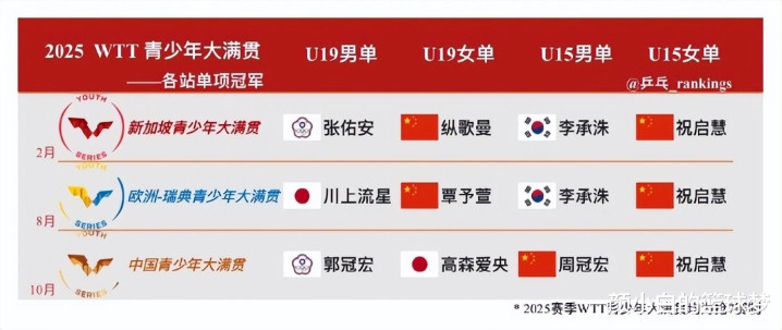 为什么说13岁的祝启慧是U15第一人呢?因为在今年的WTT青少年大满贯上,U15女单项目被祝启慧一人包圆,她拿到了三个大满贯的冠军,其余三个项目冠军都有不同。