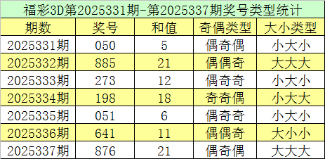 福彩3D第2025337期回顾:奖号为876,奖号奇偶比为1:2,大小比为3:0,和值为21,类型为组六。