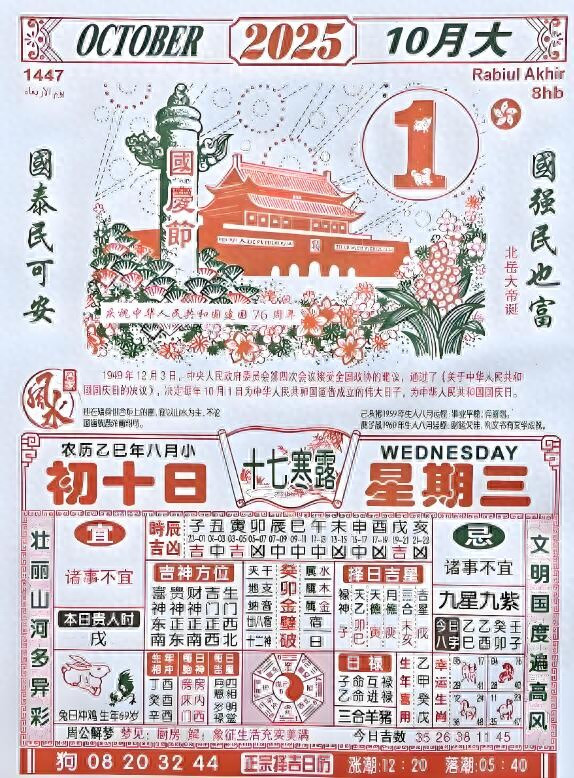 黄历心中过,遇事不出错。10月1日,星期三,农历八月初十,国庆节到了,愿我们的祖国繁荣昌盛,大家可以先留下一句:否极泰来,万事皆顺。祝福一下自己。这天值神是明堂,堪称运势助推器,象征着权力与顺遂,自带权威气场。这天处理工作、收尾规划、假期行程,还是洽谈事务,都易遇贵人提点。这天是个破日,有破除突破之意,看似带破字,却暗藏转机,适合做清理与突破相关的事,借助破的气场打破僵局。穿衣颜色推荐红色、紫色、粉色系。不推荐黄色、棕色、褐色系。打麻将求职找工作的可以去南边,约会谈恋爱的可以约在家东南边。生肖注意事项,小鼠难获认同,小牛贪图便宜,小虎好奇心强,小兔积极性高,小龙暗藏玄机,小蛇得心应手,小马不如人意,小羊得到认可,小猴时好时坏,小鸡多加小心,小狗业绩突出,小猪才思敏捷。有缘刷到,祝你开心,福生无量。